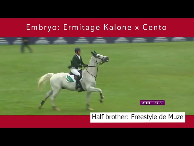An embryo with Ermitage Kalone as sire and Centa de Muze as dam. You read that right. It is not a typo. The best of both worlds combined. Ermitage Kalone (°2014) won the Belgian senior showjumping championship in 2023 in a masterful manner. Last year he also showed his exceptional showjumping qualities and limitless scope. His strong results earned him a ticket to participate in the Olympic Games in Paris, where – considering his age – he performed outstanding, individual 20th place in the final. A few months later he ranked 2nd in the 5* GCT/GCL GP in Riyadh, 3rd in the 5* GP in Mechelen and 2nd in the World Cup class in Mechelen.